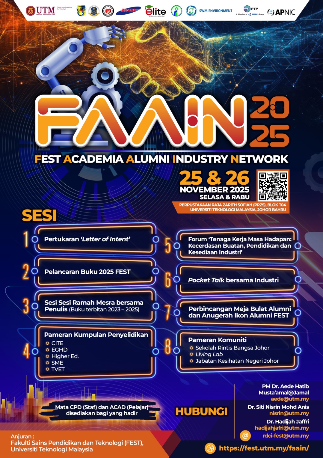 Selaras dengan aspirasi Malaysia MADANI dan Pelan Strategik Pengajian Tinggi Negara, Fakulti Sains Pendidikan dan Teknologi (FEST), Universiti Teknologi Malaysia akan menganjurkan FEST ACADEMIA ALUMNI INDUSTRY NETWORK (FAAIN) 2025: Showcase, Synergy and Smart Partnership. Program ini bertujuan untuk memperkukuhkan jaringan strategik antara FEST, alumni dan industri melalui penganjuran pelbagai aktiviti selama dua (2) hari yang melibatkan pelajar, penyelidik, alumni dan rakan industri. Ianya juga memberi penekanan terhadap pemindahan teknologi, perkongsian kepakaran, dan pembentukan ekosistem kolaboratif yang menyokong inovasi, penyelidikan gunaan serta pembangunan modal insan yang berdaya saing dan beretika. Melalui penganjuran program ini, ianya dijangka menarik penyertaan pelbagai sektor industri termasuk teknologi pendidikan, kejuruteraan, automasi, AI, TVET, pengurusan sumber manusia, pembangunan modal insan dan banyak lagi. Program ini diharap dapat menjadi landasan kepada pengenalan hasil penyelidikan FEST, pertukaran idea, peluang latihan industri dan pengiktirafan usaha inovatif, warga fakulti, alumni dan industri.