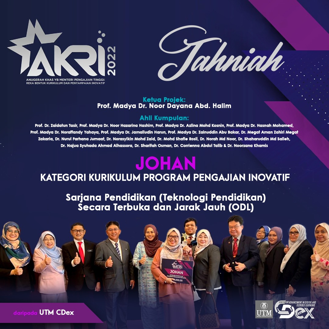 The Master of Education (Educational Technology) ODL Programme was awarded the prestigious Anugerah Khas Rekabentuk Kurikulum dan Penyampaian Inovatif (AKRI) 2022 by Ministry of Higher Education and successfully achieved ASEAN University Network-Quality Assurance (AUN-QA) Programme Assessment in 2025, marking its international academic recognition.